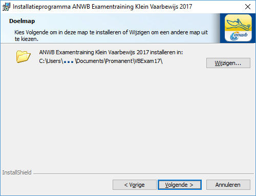 Doorloop de verschillende stappen van het installatieprogramma en volg de aanwijzingen de u krijgt. In de stap waarin de "doelmap" getoond wordt hoeft u in principe niets te wijzigen. Standaard verwijst deze naar de map Documents of Mijn documenten onder uw gebruikersaccount van Windows. Als er meerdere gebruikers op één pc zijn dan moet u de examentraining installeren terwijl u bent ingelogd met te gebruikersaccount waarmee u straks ook de examentraining gaat gebruiken.