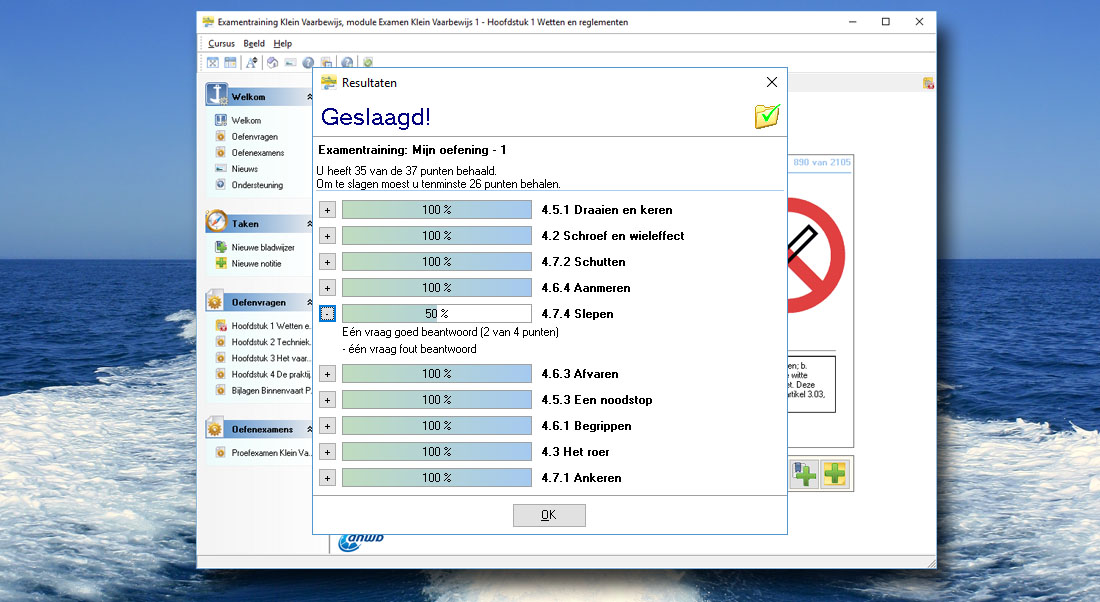 Nadat u een oefening gemaakt en gestopt heeft ziet u een samenvatting van het resultaat en uw score over de verschillende onderwerpen in de oefening. De onderwerpen zijn ingedeeld, zoals in het ANWB Cursusboek Klein Vaarbewijs. Zo ziet u snel welke onderwerpen uit welk hoofdstuk u nog eens nader kunt bestuderen.
